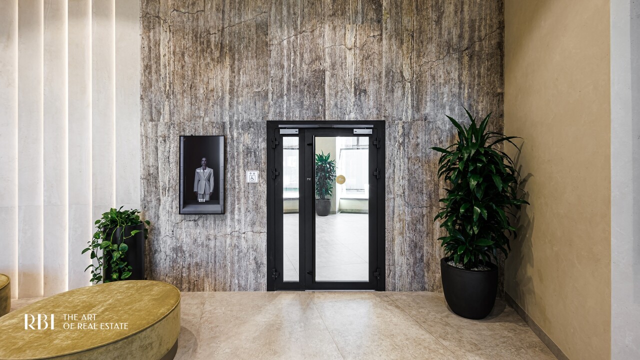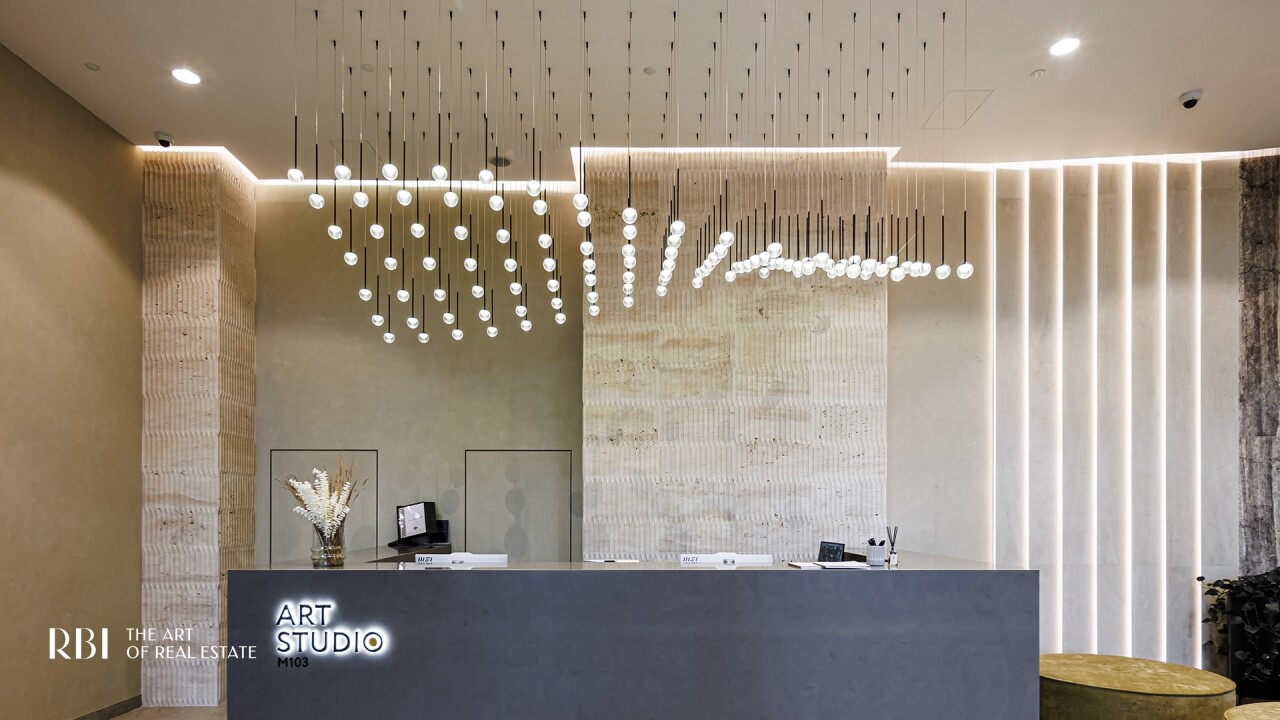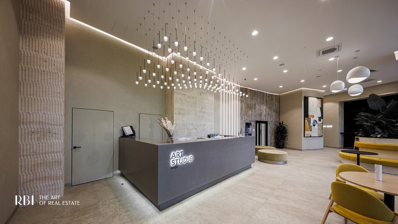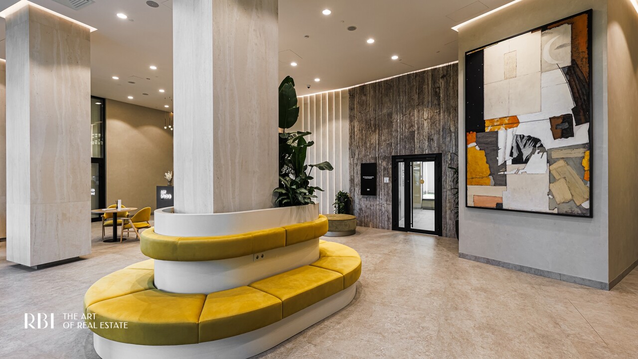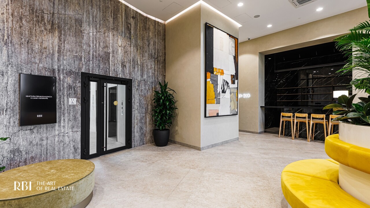 Лобби ARTSTUDIO M103 украшает абстрактная картина Вячеслава Михайлова – авторская аллюзия на тему петербургской архитектуры.